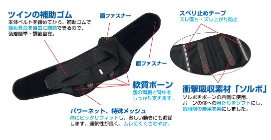 ○スベリ止めテープ ズレ落ち・ズレ上がり防止 ○ツインの補助ゴム 本体ベルトを締めてから、補助ゴムで締め具合を自由に調節できるので、装着簡単・調節自在。