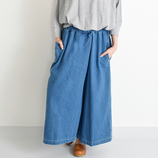 マキシロング丈【たっぷりワイド】超ワイドなデニムフレアパンツ♪ウエストのデザインが凝っているデニムガウチョパンツ♪【レディース・婦人服・ボトムス・ガウチョ・綿混・コットン混】[春物][夏物][秋物][冬物]