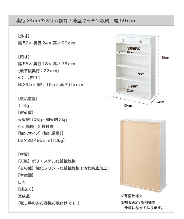 外寸 幅59×奥行24×高さ90cm 内寸 幅55×奥行18×高さ76cm(最下段奥行:22cm) 引出し内寸: 幅23.5×奥行16.5×高さ6.5cm 商品重量 約11kg 耐荷重 天板約10Kg・棚板約3kg ※可動棚 3枚付属 素材 〔天板〕ポリエステル化粧繊維板 〔その他〕強化プリント化粧繊維板(汚れ防止加工) 完成品 (取っ手のみお客様お取付けです。